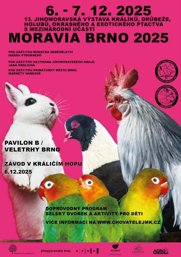 Srdečně vás zveme na 13. jihomoravskou výstavu drobného zvířectva s mezinárodní účastí, která se koná v sobotu a neděli 6.–7. 12. 2025 na brněnském výstavišti.